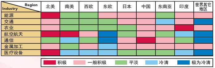 表8是ILS對工業激光加工市場的機遇的總結。這張圖表總結了工業激光器在全球市場的發展機遇,主要是基于已發布的關鍵行業的銷售報表和訂單庫存。本報告中呈現的表格已是最新版本,并已考慮了上述提及的全球經濟情況。簡單來說,我們應該在所有紅色、粉紅色的領域加強表現,同時也要關注綠色部分。北美和亞洲(日本、中國、東南亞和印度)是活躍的制造業市場,在這些地區,能源、交通、航空航天和金屬零件加工等市場還比較積極,或者至少是一般積極。