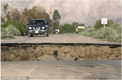地震給地面造成的破壞:大地震后,墨西哥城市墨西卡利公路上出現一條大裂縫。