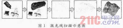 0 引言 自然對象和大部分的人造對象都具有復(fù)雜的三維形狀,如何在計(jì)算機(jī)中建立三維對象的計(jì)算機(jī)模型就是三維形狀的數(shù)字化問題,該項(xiàng)研究源于20世紀(jì)六七十年代。三維形狀復(fù)雜多變、形狀繁多,而且其外觀、材質(zhì)、顏色、用途等各不相同,這就使得三維形狀數(shù)字化的問題非常復(fù)雜,至今,該項(xiàng)技術(shù)尚未成熟,仍是數(shù)字化技術(shù)研究的難點(diǎn)。目前,三維形狀數(shù)字化技術(shù)種類很多,包括機(jī)械、聲學(xué)、光學(xué)、電磁等類型,其中運(yùn)用得最廣泛、效果最好的是光學(xué)測量技術(shù)。光學(xué)測量是光電技術(shù)、機(jī)械測量、計(jì)算機(jī)技術(shù)相結(jié)合的產(chǎn)物,可以實(shí)現(xiàn)快速,準(zhǔn)確的測量。該項(xiàng)技術(shù)具有速度快、精度高、非接觸、易于自動化的特點(diǎn),主要適用于自由曲面的測量。目前,光學(xué)測量技術(shù)得到了越來越廣泛的應(yīng)用,其中最典型的應(yīng)用是三維激光掃描儀。 1 三維激光掃描儀的工作原理 三維激光掃描儀是基于激光掃描測量的原理而設(shè)計(jì)的,主要作用是對三維形狀進(jìn)行數(shù)字化,基本工作原理是:線激光器發(fā)出的光平面掃描物體表面,面陣CCD采集被測物面上激光掃描線的漫反射圖像,在計(jì)算機(jī)中對激光掃描線圖像進(jìn)行處理,依據(jù)空間物點(diǎn)與CCD面陣像素的對應(yīng)關(guān)系計(jì)算物體的景深信息,得到物體表面的三維坐標(biāo)數(shù)據(jù),快速建立原型樣件的三維模型,如圖1所示。