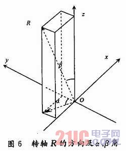 為精確標(biāo)定轉(zhuǎn)臺中心軸線,提出如下方案:在圖4的轉(zhuǎn)臺上固定一個標(biāo)定球。通過數(shù)控系統(tǒng)控制轉(zhuǎn)臺旋轉(zhuǎn),控制球的球心繞轉(zhuǎn)軸R形成一個圓,該圓的圓心O“是R上的點(diǎn),該圓所在平面的法矢即為R的方向。 基于該思路,在xyz三軸測量系統(tǒng)中測量并計(jì)算標(biāo)定球三個不同位置的球心P1(x1,y1,z1),P2(x2,y2,z2),P3(x3,y3,z3),P1,P2,P3所在平面的法矢量N即為轉(zhuǎn)臺中心軸線的方向。 有了轉(zhuǎn)臺中心軸線的方向,還需要確定空間三點(diǎn)P1,P2,P3繞轉(zhuǎn)軸R形成圓的圓心O”(x0,y0,z0)才能使轉(zhuǎn)臺中心軸線定位。如圖6,為了求O“,首先計(jì)算轉(zhuǎn)軸R在xOy面上的投影與y軸夾角α、R與z軸的夾角β,然后P1,P2,P3依次繞z軸、x軸旋轉(zhuǎn)到與xOy平行的平面上,旋轉(zhuǎn)矩陣分別為: