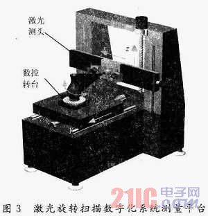 3 系統(tǒng)構(gòu)成 圖3是三維旋轉(zhuǎn)激光掃描系統(tǒng)的測量平臺,x軸左右運(yùn)動,向左為正向;y軸前后運(yùn)動,向前為正向;z軸上下運(yùn)動,向上為正;三軸之間互相垂直;數(shù)控轉(zhuǎn)臺安裝在沿y軸運(yùn)動的花崗巖工作臺面上。激光測頭隨x軸的拖板一起運(yùn)動。