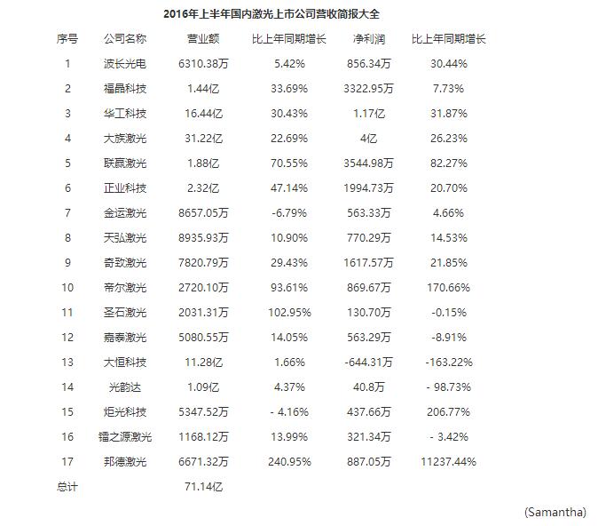 截至今年年中,國內激光上市公司基本上已經發布了2016上半年業績報告,本網摘錄整理,為讀者一一介紹。本文提及到的上市公司包括了在滬深主板、中小板、創業板和新三板上市的激光相關公司,涉及公司的業績總量為71.17億元,這些公司都是國內激光行業比較出色的代表,從他們的業績情況,基本上可以窺探國內2016上半年激光產業的情況與發展趨勢。需要說明的是,本文提及的激光上市公司,有個別公司業績不完全是激光業務,包括華工科技、正業科技、大恒科技等,它們還有其他非激光業務。 從總體來看,2016年上半年大多數激光上市公司的業績都有大幅度的增長,在制造業持續低迷的大背景下,激光產業的發展顯得更加生機蓬勃。然而也不得不注意到,國內經濟發展放緩、行業內競爭激烈等因素對部分上市公司造成了明顯影響,使得這些公司的凈利潤出現了一定程度下降。 以下來給各位詳細介紹: 波長光電營收6310.38萬元,凈利潤同比增長30.44% 波長光電2016上半年業績“雙豐收”,其中,營業收入6310.38萬元,同比增長5.42%;歸屬于掛牌公司股東的凈利潤856.34萬元,同比增長30.44%。波長光電表示,營業收入比上年同期增加了5.42%,主要是因為公司的主要產品元件類產品較去年同期銷售增長了360萬元。此外,波長光電在研發上也是成果頗多,據了解,波長光電今年上半年新增了4項專利。 福晶科技營收1.44億,同比增長33.69% 福晶科技2016上半年實現營業收入14,361.79萬元,比上年同期增長33.69%;實現營業利潤3,963.09萬元,比上年同期增長16.29%;實現歸屬于上市公司股東的凈利潤3,322.95萬元,比上年同期增長7.73%。 2016年固體激光器發展勢頭強勁,公司充分發揮在該領域的龍頭優勢,合理安排產能,提升生產效率,晶體類產品實現41.94%的增長,繼續保持了優勢地位。 華工科技營收16.44億,激光設備銷售增長71% 華工科技2016上半年實現營業收入16.44億元,同比增長30.43%;歸屬于上市公司股東的凈利潤1.17億元,同比增長31.87%。報告期內,公司光電器件和激光加工業務板塊收入比有較大幅度的增長,從而提升了公司盈利水平。 激光設備和光通信器件銷售高增長,大超市場預期。激光設備制造板塊實現銷售收入5.90億元,同比增長71.08%,毛利率提升3.46%至29.41%,主要因國際市場的拓展成效顯現,中小功率系列產品銷售額大幅度提升,以及高功率智能裝備業務的穩步推進。 大族激光營收31.22億元,同比增長22.7% 大族激光2016上半年營業收入為31.22 億元,同比增長22.69%;歸屬上市公司股東凈利潤為4.00 億元,同比增長26.23%;歸屬上市公司股東扣非凈利潤為3.90 億元,同比增長37.22%。 公司小功率激光器今年受到國際大客戶加工設備更新需求的拉動增長較為明顯,但由于一方面大客戶的設備投資趨于謹慎,另一方面交期以及訂單確認的時間差導致部分訂單尚未確認收入,影響上半年收入增速。公司的多項新業務拓展迅速,動力電池設備未來有望為公司貢獻新的增長點。 聯贏激光營收1.88億,同比增長70.55% 聯贏激光2016上半年實現營業收入18,779.22萬元,同比增長70.55%;實現凈利潤3,544.98萬元,比去年同期增長82.27%。業績大幅增長主要原因是:新能源汽車行業爆發增長,帶來龐大市場空間,以及生產能力得到提高。 正業科技營收2.32億,同比增長47.14% 正業科技2016上半年營業收入23,212.85萬元,比上年同期上升47.14%,實現利潤總額2,119.50萬元,比上年同期上升10.13%,實現凈利潤1,994.73萬元,比上年同期上升20.70%;其中,實現歸屬于母公司股東的凈利潤1,994.73萬元,比上年同期上升20.70%。 雖然國內整體市場經濟環境較差,但因公司PCB業務實現了穩健發展,在鋰電行業的訂單較為充足以及被并購企業實現了財務并表。公司X光系列檢測設備取得了較好的銷售業績,特別是在動力電池領域的銷售取得了重大突破。 金運激光營收8657.05萬,同比下降6.79% 金運激光2016上半年實現營業收入8657.05萬元,較上年同期減少6.79%,歸屬于母公司所有者的凈利潤563.33萬元,較上年同期增加4.66%。業績下降的原因主要是非金屬激光部分系列產品和3D打印及其他收入較上年有一定的減少。公司 3D打印板塊業務目前仍處于不斷上升發展期,但短期內難以迅速擴大收入和盈利。 天弘激光營收8936萬元,凈利潤增長15% 天弘激光2016上半年實現營業收入為8935.93萬元,較上年同期增長了10.90%;凈利潤為770.29萬元,較上年同期增長了14.53%。業績增長的主要原因在于:在數控激光切割設備上,繼續產品差異化競爭,數控激光切割機項目收入較上年同期增長10.12%;在激光3D打印上,新增再制造和強化加工服務點,設備銷售及加工收入較上年同期增長112.58%。 奇致激光營收7821萬元 同比增長29% 奇致激光2016上半年實現營業收入為7820.79萬元,較上年同期增長29.43%;歸屬于掛牌公司股東的凈利潤為1617.57萬元,比上年同期增長21.85%。業績增長的主要原因為公司優化市場布局,引進新代理商,擴大產品銷售渠道,調動代理商積極性,促進了產品銷售。 帝爾激光營收2720.10萬元,凈利潤同比增長170.66% 帝爾激光2016上半年實現營業收入為2720.10萬元,較上年同期增長93.61%;凈利潤為869.67萬元,比上年同期增長170.66%。業績增長的主要原因是公司對激光消融設備成功進行定型,并投入批量生產,隨著設備生產成本的控制,激光消融設備毛利較上年同期也大幅提升,帶動了主營收入毛利的提升。 圣石激光營收2031.31萬元,同比增長102
