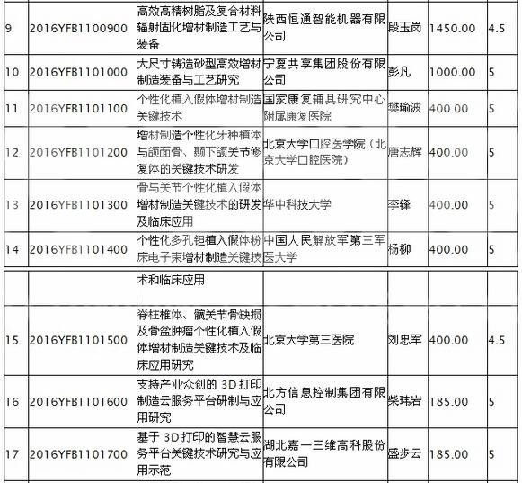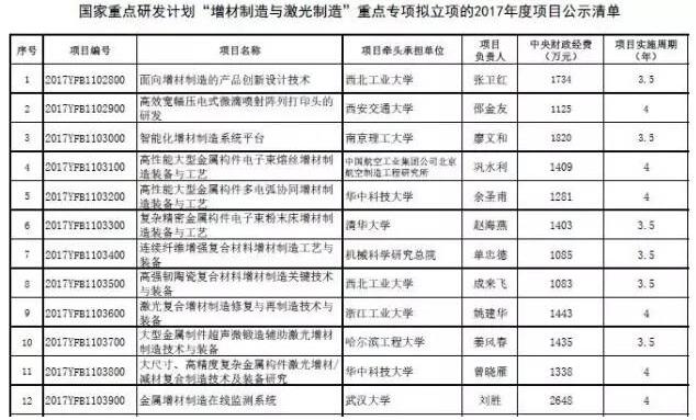 2017年,擬在2個方向啟動19-38個項目,其中支持的項目內容涵蓋了設計算法、噴射打印頭裝置、智能增材制造平臺、大型電子束熔絲制造技術、電子束粉末床熔化制造技術、連續纖維增強復合材料制造工藝、陶瓷增強復合材料制造裝備、激光修復與再制造裝備、超聲增材制造技術、大型增材/減材制造裝備、金屬增材制造過程中監測系統、增材制造在航空航天領域的產業化研究、增材制造在個性化醫療器械領域的應用等。以下為公示清單:
