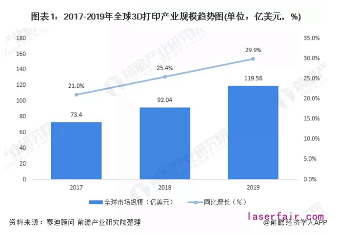 為解決疫情防控中應(yīng)急物資短缺的難題,美國、意大利等國紛紛利用3D打印機生產(chǎn)呼吸機配件、個人防護(hù)面罩,甚至還創(chuàng)建了在線論壇,用于政府、醫(yī)院、非政府組織發(fā)布需求,以及業(yè)內(nèi)人士分享經(jīng)驗等。3D打印在全球疫情防控中發(fā)揮的作用,反映出這項技術(shù)普及度的提高和應(yīng)用領(lǐng)域的擴(kuò)展。全球3D打印市場規(guī)模破百億美元3D打印技術(shù)最早可以追溯到1976年噴墨打印機的發(fā)明。20世紀(jì)80年代以后,3D打印行業(yè)受到國內(nèi)外的廣泛關(guān)注,各種3D打印技術(shù)也在多個行業(yè)應(yīng)用并發(fā)展。目前已覆蓋了制造、醫(yī)療、教育、航空航天、軍事等多個領(lǐng)域。根據(jù)2020年3月賽迪顧問發(fā)布的《2019年全球及中國3D打印行業(yè)數(shù)據(jù)》,2019年,全球3D打印產(chǎn)業(yè)規(guī)模達(dá)119.56億美元,增長率為29.9%,同比增長增加4.5%。