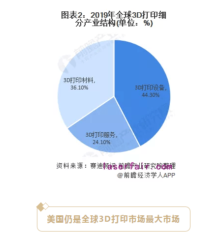 2019年,全球3D打印產(chǎn)業(yè)結(jié)構(gòu)中,3D打印設(shè)備為核心產(chǎn)業(yè),其產(chǎn)業(yè)規(guī)模為52.97億美元,占比達(dá)到44.3%;其次為3D打印服務(wù)產(chǎn)業(yè)規(guī)模37.78億美元,占比達(dá)到31.6%;3D打印材料產(chǎn)業(yè)規(guī)模28.81億美元,占比24.1%。