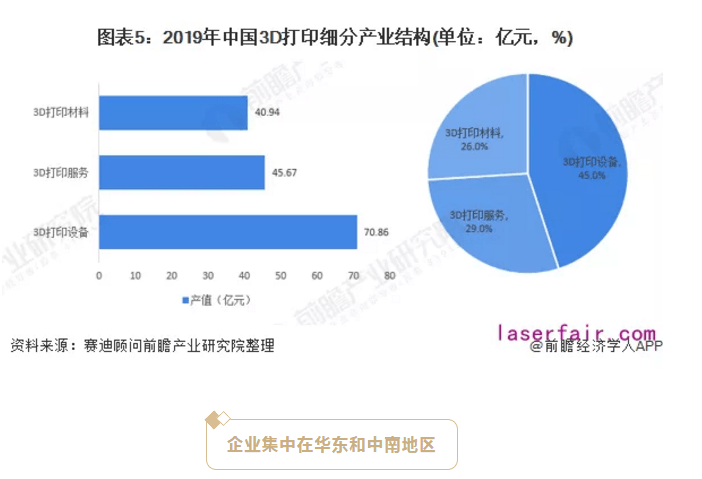 2019年,中國3D打印設(shè)備產(chǎn)業(yè)規(guī)模70.86億元,占比最高,達(dá)到45%;3D打印服務(wù)產(chǎn)業(yè)規(guī)模45.67億元,占比29%;3D打印材料產(chǎn)業(yè)規(guī)模40.94億元,占比26%。
