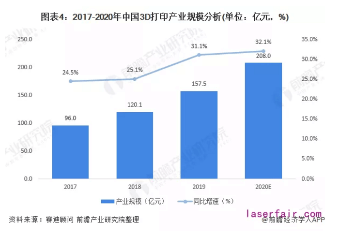 近年來,我國3D打印市場應(yīng)用程度不斷深化,在航空航天汽車、船舶、核工業(yè)、模具等領(lǐng)域均得到了越來越廣泛的應(yīng)用。3D打印技術(shù)已經(jīng)成為航空航天等領(lǐng)域直接制造機修復(fù)再制造的重要技術(shù)手段。在汽車、船舶、核工業(yè)、模具等領(lǐng)域成為產(chǎn)品設(shè)計、快速原型制造的重要實現(xiàn)方式。2017-2020年,我國3D打印產(chǎn)業(yè)規(guī)模逐年增加,增加速度要略快于全球整體增速,以致于我國3D產(chǎn)業(yè)占全球的比重在不斷增加。根據(jù)2020年3月賽迪顧問發(fā)布的《2019年全球及中國3D打印行業(yè)數(shù)據(jù)》,2019年,中國3D打印產(chǎn)業(yè)規(guī)模為157.5億元,較上年增加31.1%。