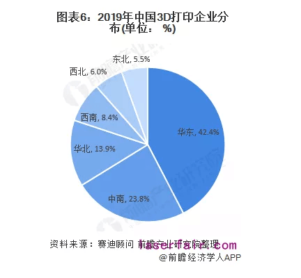 2019年,華東地區(qū)為中國3D打印企業(yè)主要聚集區(qū)域,占據(jù)全國42.4%。中南、華北、西南等地區(qū)也有優(yōu)秀企業(yè)集聚,分別占據(jù)23.8%、13.9%和8.4%的企業(yè)資源。華東地區(qū)的3D打印知名企業(yè)包括湖南華曙高科技有限責(zé)任公司、杭州先臨三維科技股份有限公司、上海光韻達(dá)三維科技有限公司、上海曼恒數(shù)字技術(shù)有限公司;中南地區(qū)的3D打印知名企業(yè)包括深圳市光華偉業(yè)實業(yè)有限公司、湖北嘉一三維高科股份有限公司等。