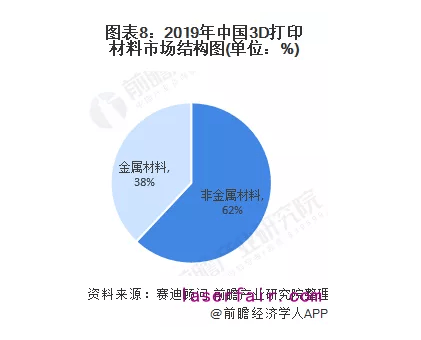 2019年,中國3D打印材料產(chǎn)業(yè)結(jié)構(gòu)中,非金屬材料產(chǎn)業(yè)規(guī)模25.38億元,占比最高,達(dá)到62%;金屬材料產(chǎn)業(yè)規(guī)模15.56億元,占比38%。