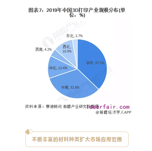2019年,中南和華東地區(qū)由于3D打印設(shè)備與服務(wù)能力突出,產(chǎn)業(yè)規(guī)模分布位居全國第一、第二,分別占比37.2%和32.6%。華北地區(qū)則由于3D打印材料和服務(wù)能力突出,產(chǎn)業(yè)規(guī)模位居全國三位,占比12.4%。