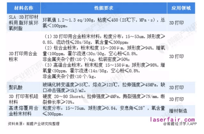 2019年12月,工業(yè)和信息化部關(guān)于印發(fā)《重點新材料首批次應(yīng)用示范指導(dǎo)目錄(2019年版)》,其中公布了6項與3D打印相關(guān)的重點新材料,分別為SLA 3D打印材料用脂環(huán)族環(huán)氧樹脂、3D打印用合金粉末、聚乳酸、3D打印有機硅材料和高速熔覆用合金粉末材料。