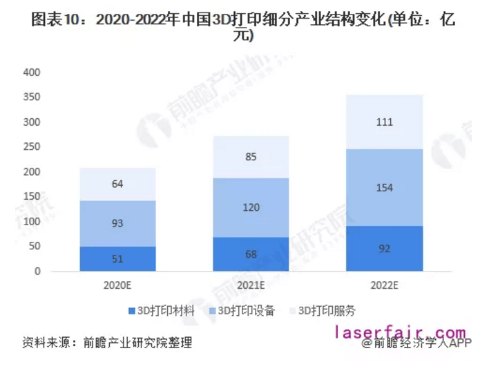 預(yù)計2020-2022年,3D打印設(shè)備依舊占據(jù)最大份額,占比逐年小幅下降,2022年,產(chǎn)業(yè)規(guī)模為154億元,占比達(dá)到43%。3D打印服務(wù)占比上漲,2022年,產(chǎn)業(yè)規(guī)模為111億元,占比為31%。3D打印材料未來三年占比保持穩(wěn)定,2022年,產(chǎn)業(yè)規(guī)模為92億元,占比26%。