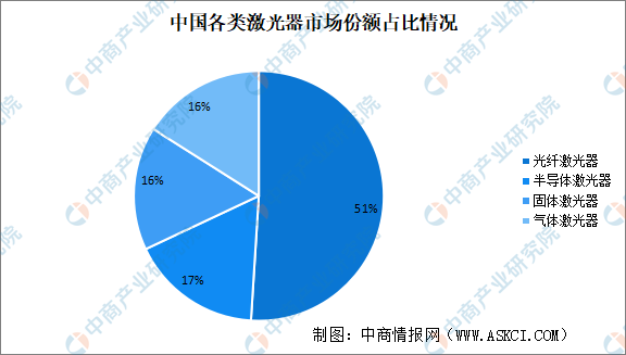 激光器的性能決定著激光設備輸出光束的質量和功率,是下游激光設備最核心的部件之一。根據增益介質的不同,激光器可分為光纖激光器、半導體激光器、固體激光器和氣體激光器。其中,光纖激光器因高效率、多用途、低維護成本的特點受到下游客戶的青睞。在應用領域,光纖激光器已成為最大的激光器品類,市場份額超過一半。光纖激光器主要應用在工業領域,而醫學領域主要還是以半導體、固體及氣體激光為主,三者合計占比49%。