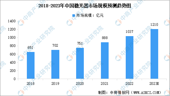激光器市場規模增長,并在醫學領域扮演著重要角色隨著現代制造業朝著自動化、智能化的方向發展,5G商業化應用程度不斷加深,半導體及光學、顯示和消費電子等行業都處于持續增長狀態,激光設備的需求持續增加,進而帶動著激光器行業快速發展。中商產業研究院發布的《2023-2029年中國激光器市場前景及投資機會研究報告》顯示,2022年中國激光器市場規模達到1037億元,同比增長16.78%。中商產業研究院分析師預測,2023年中國激光器市場規模增至1210億元。