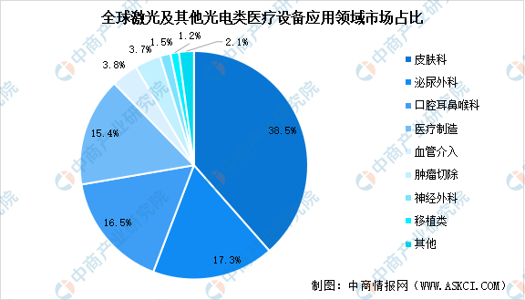 在醫療領域中,激光及其他光電類醫療器械逐漸普及,已廣泛運用于眼科(如近視矯正、視網膜修補等)、外科(激光手術刀)、內科、婦科、耳鼻喉科、心血管科、皮膚科等多個領域。2021年,全球激光及其他光電類醫療設備應用市場中,皮膚治療類應用依然是占比最大的領域,占比約為38.5%;其次是泌尿外科、口腔耳鼻喉科和醫療制造領域,占比分別為17.3%、16.5%和15.4%;隨后是血管介入治療、腫瘤切除、神經外科手術領域,占比分別為3.8%、3.7%和 1.5%。