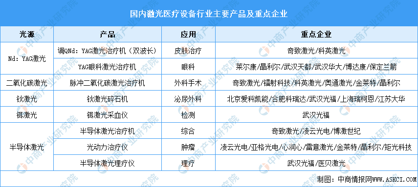 激光醫療設備國產化率提升,資本市場表現活躍目前國內約有上百家激光醫療器械企業,按綜合競爭力可分為兩大梯隊。其中,第一梯隊以外資企業和國內少數優勢企業為主,代表性廠商有以色列飛頓(Alma)、奇致激光、科醫人(Lumenis)和賽諾秀(Cynosure)、歐洲之星(Fotona)、賽諾龍(Syneron)、半島醫療、深圳吉斯迪、吉林科英等。第二梯隊以國內若干小型制造企業為代表,這類企業普遍起步較晚,技術積累較少,受制于醫療器械行業本身的高門檻,其產品很難進入被外資和本土優勢企業包圍的醫院等中高端市場。從國產化率來看,在各類激光治療設備中,氣體激光器、Nd:YAG激光器等技術較為成熟的產品已經實現了國產化,而高功率半導體激光醫療設備研制則相對匱乏,關鍵產品仍需依賴進口。目前,已經批量上市的國產醫療激光設備產品及典型企業如下表所示: