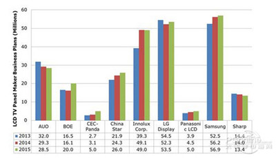 在最近的一兩年,我們可以看到經(jīng)過幾個重大的變化之后液晶電視的發(fā)展到了一個瓶頸的位置,無論從技術(shù)上,還是從市場上,發(fā)展速度都大不如前,這可以從各大廠商的銷售量增長曲線上可以看出。根據(jù)DisplaySearch LCD TV液晶電視價值鏈&分析季度報告和大尺寸TFT(薄膜晶體管)面板出貨量季度報告顯示,電視面板廠商2015年的出貨目標(biāo)為2億5,700萬片,僅比2014年的2億4,900萬片增長3% 。